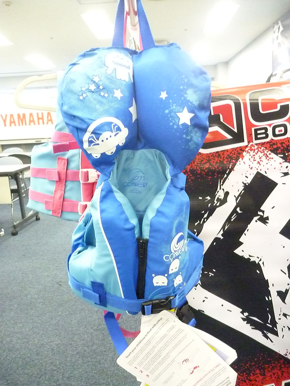 頭を支える浮力体と股に掛かるベルトが付いています。ライフベストが脱げないようになっています。