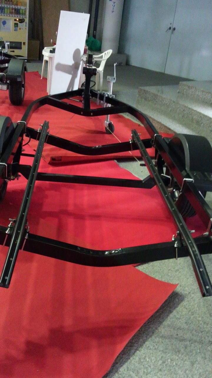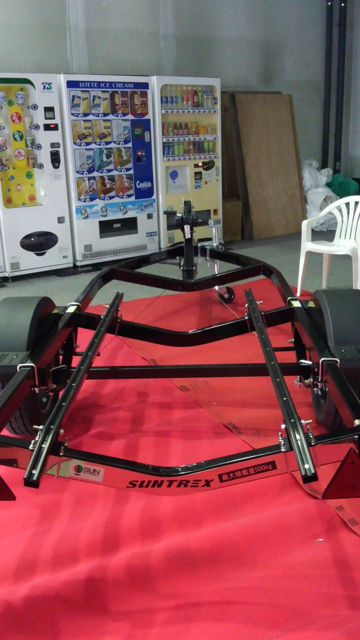 ▲低重心とするため、横のフレームを約40mm下げているそうです。(サントレックストレーラーと比較)