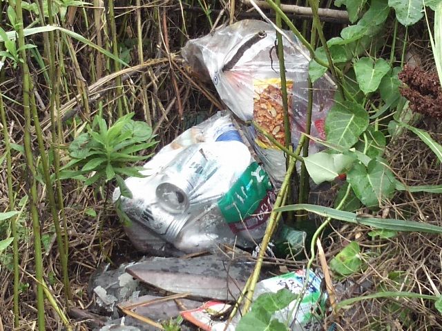 ▼ビールの空き缶やおつまみの包装などが、草むらに隠すように捨てられていました。