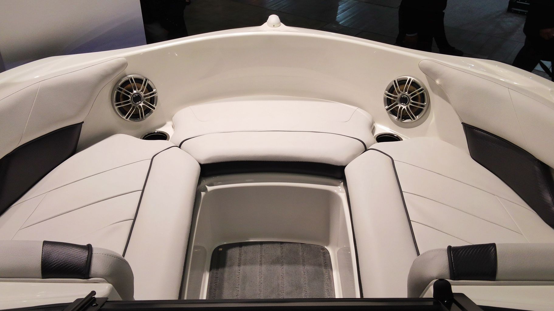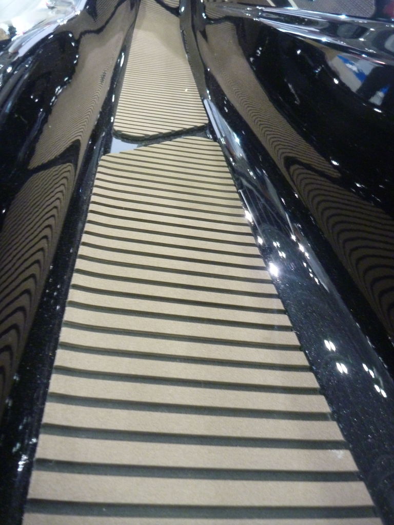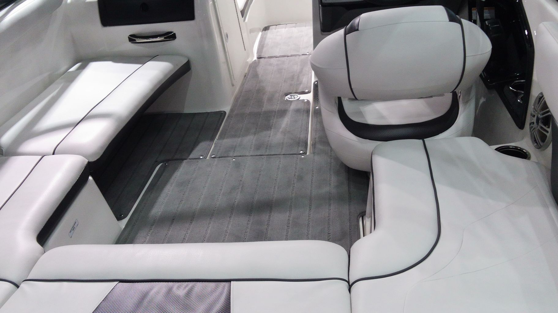 バウシートに続く通路のマット下は、ウエイクボードがすっぽりと入る、大型のストレージとなっています。