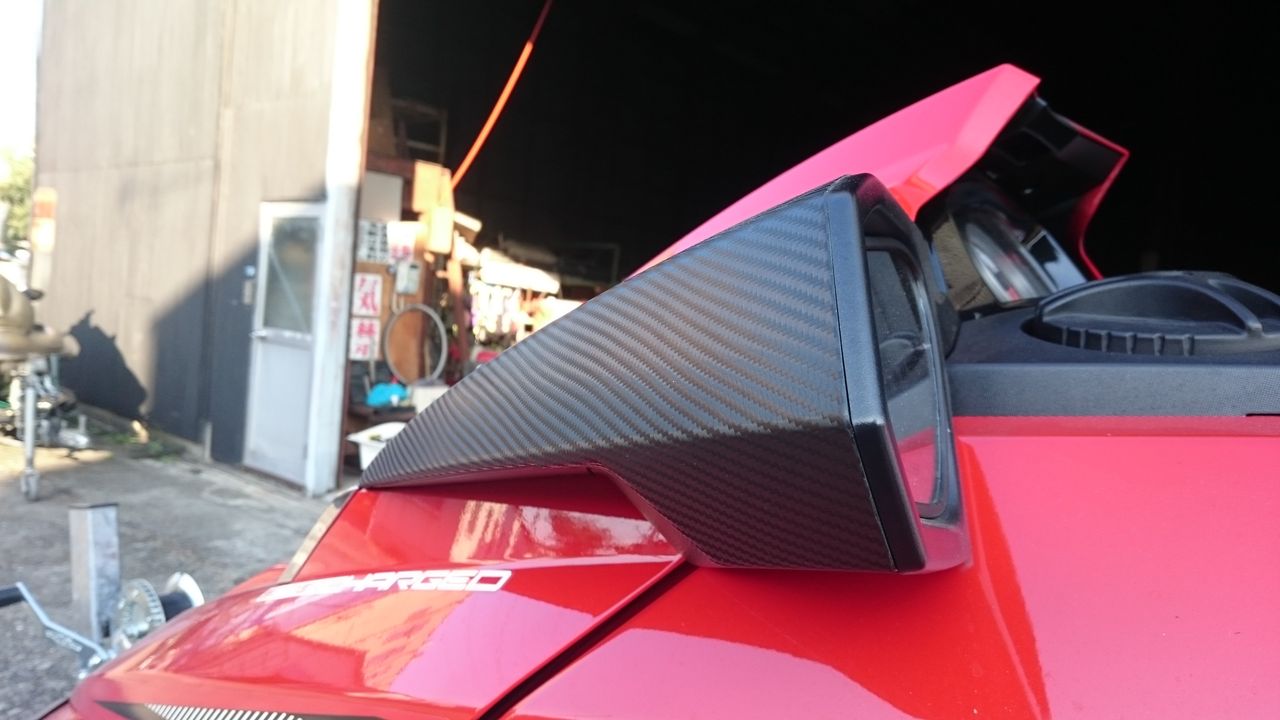 ▼弊社で特別に施工を加えたカーボンミラーです。