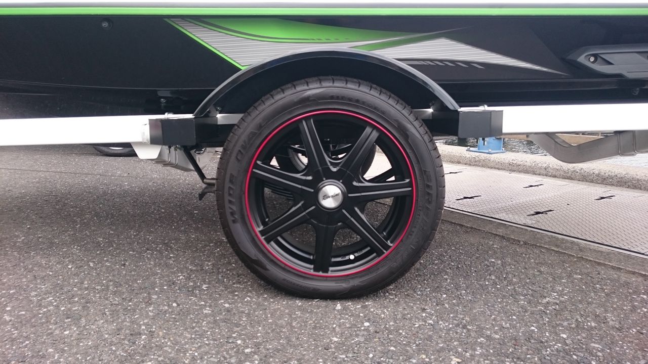 ▲ワイドタイヤ、ブラックホイール、レッドリム で他にはないトレーラーで、かっこイイ感じに仕上がっています!!