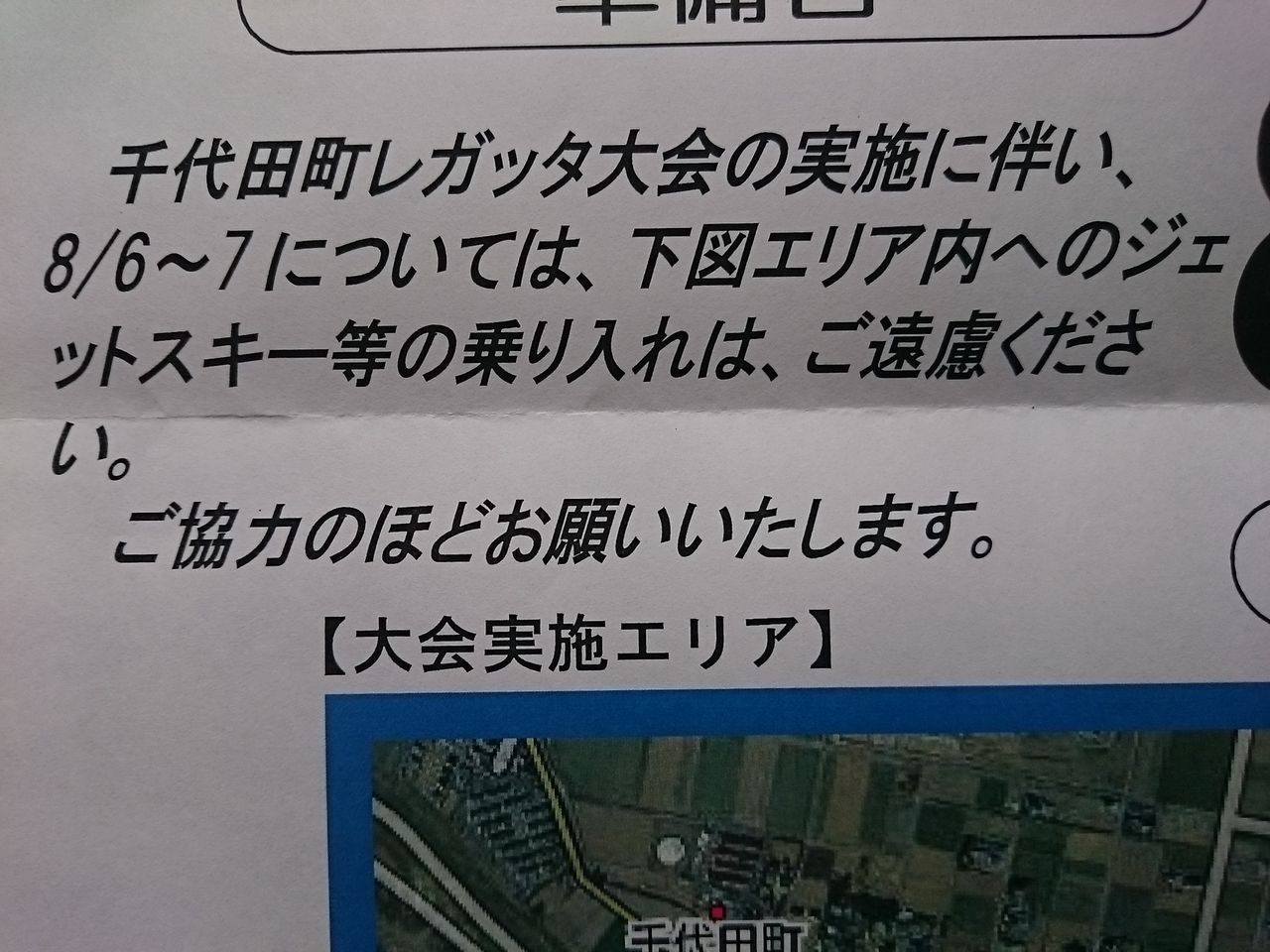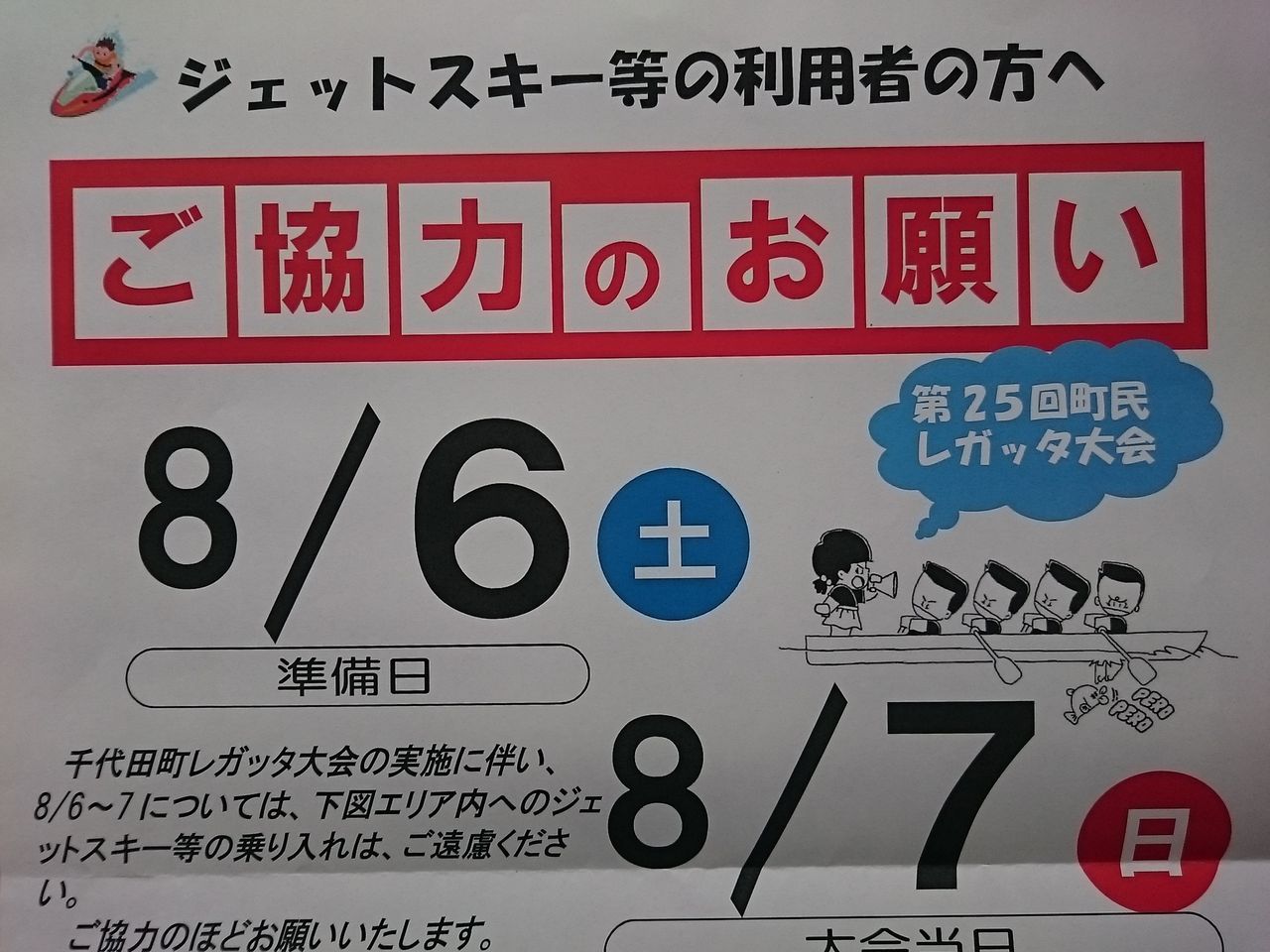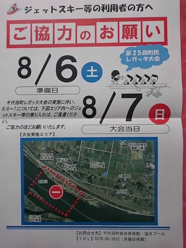 ご協力のお願い 2016年6月16日 木曜日 12:13 ジェットスキー等の利用の方へご協力のお願いのお知らせ との通知が千代田町より参りましたので、ジェットユーザー様や水面利用の方々は、エリア内の乗り入れをご配慮の程よろしくお願い致します8月6日(土)、7日(日)千代田町レガッタ退会の実施に伴い、8/6~7については、下記エリア内へのジェットスキー等の乗り入れは、ご遠慮ください。ご協力のほどお願いいたします。また、大会実施に伴いまして、ボート教室を7月2日~31日の土日(計10回)午前中に実施するそうですので、曳き波などに気をつけ、皆様の安全走行をお願い致します。