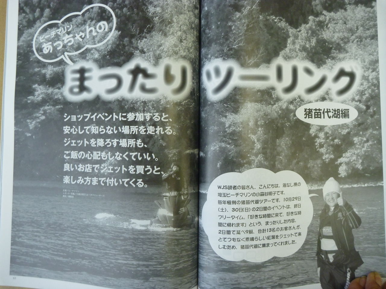 WJSM29年1月号発売中! 2016年12月27日 火曜日 11:16 ビーチマリンにて、ワールドジェットスポーツマガジン1月号発売中!ビーチマリン猪苗代湖紅葉ツーリング10月29日(土)~30日(日)のイベントが掲載されていますダイナミックな紅葉の景色やみんなで作って食べるちゃんこ鍋など、季節なりに様々とジェットに乗る楽しみがあるということがわかりましたそれに、誰もいないゲレンデを自由に走れる爽快感と開放感一度味わったら、やめられませんよ来年の紅葉ツーリングは2017年11月4日(土)~5日(日)予定しています。今年参加した方も、参加できなかった方も、ぜひ私たちと一緒に行きましょう
