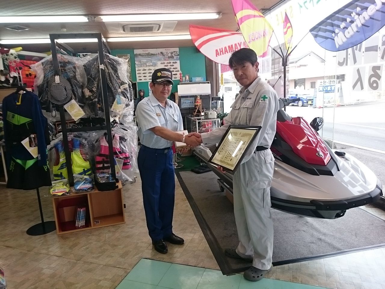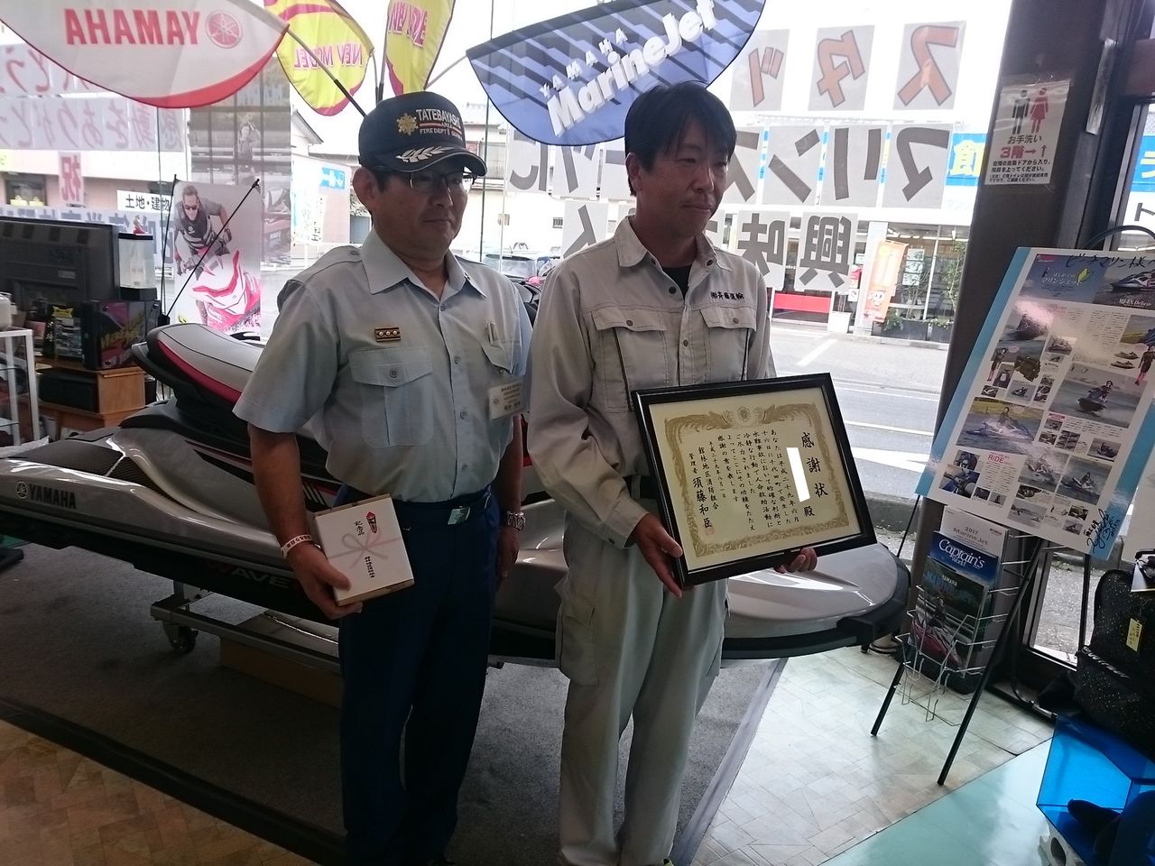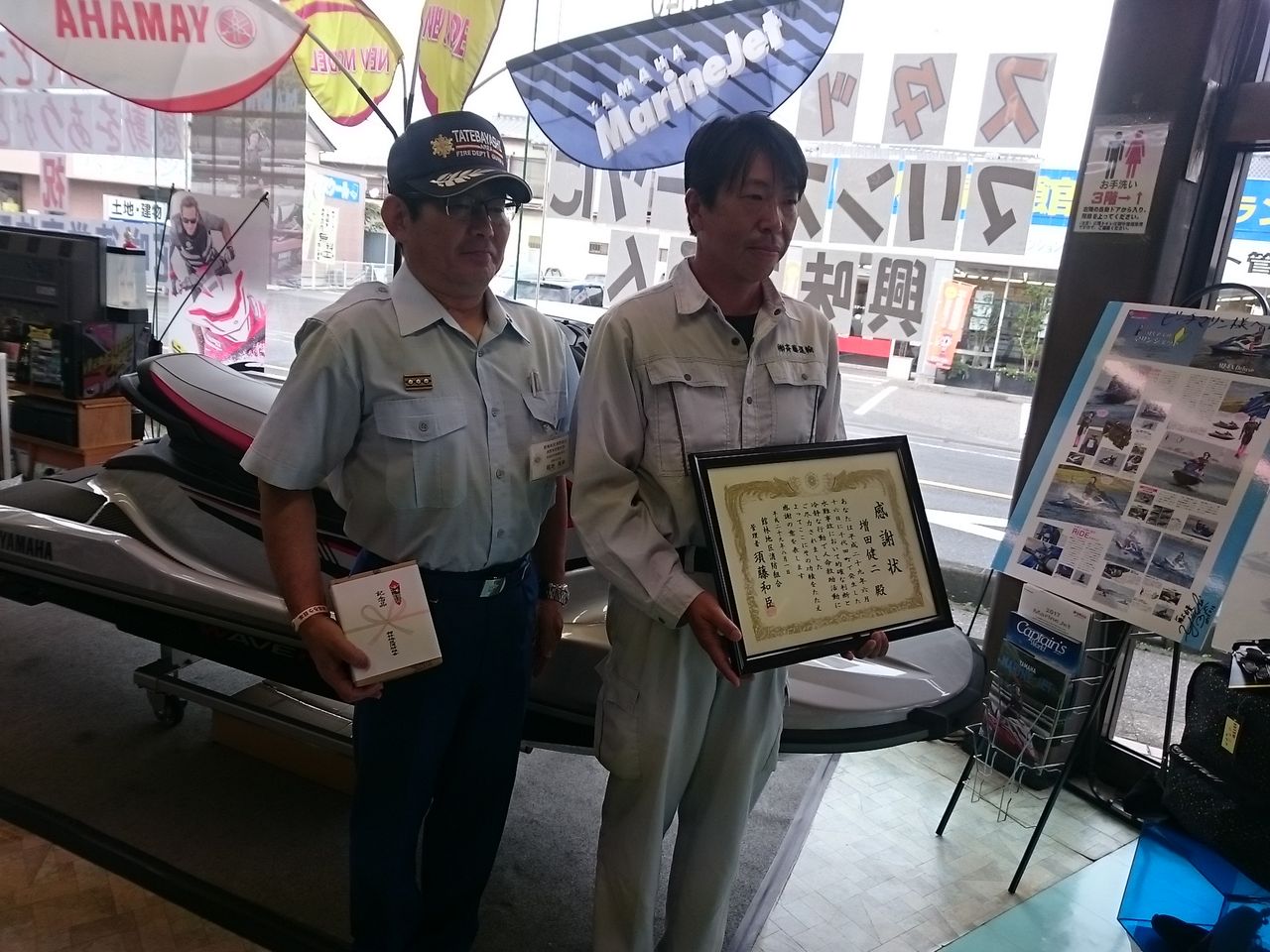 偶然近くに居合わせていたM様は、自らの水上バイクを利用し、自身の危険を顧みず人命1名を無事救助しました。