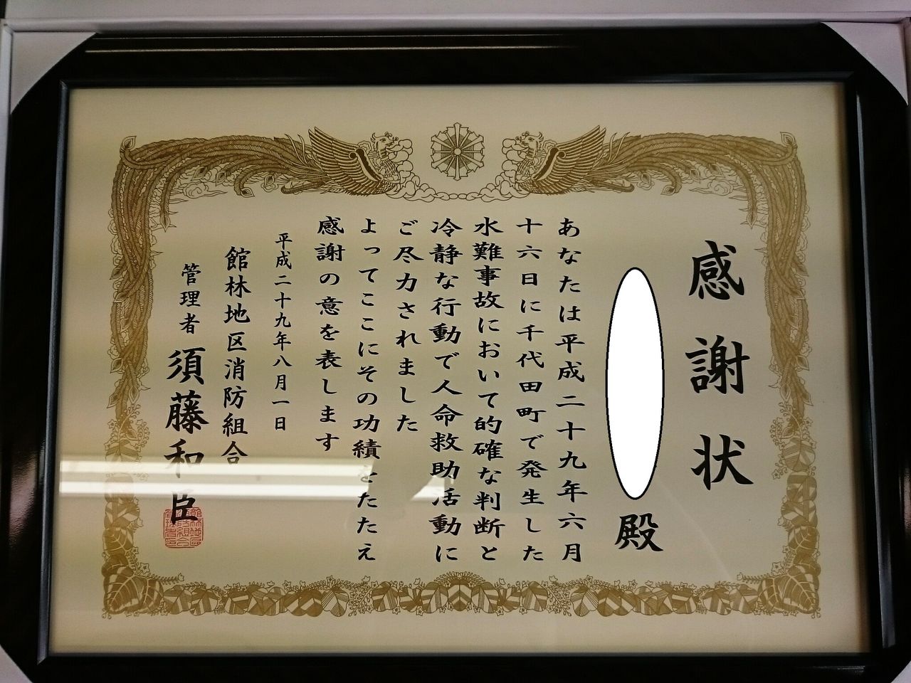 その勇敢な行動に対し、市の方から感謝状を頂きました。