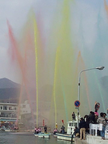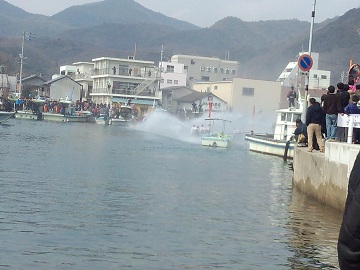 紅白の旗をあげ、源平に分かれた消防団員が、海上で相手を狙って放水合戦を行う。最後は一年の安泰を祈念し、五色の水を天高く放水しフィナーレを飾ります。
