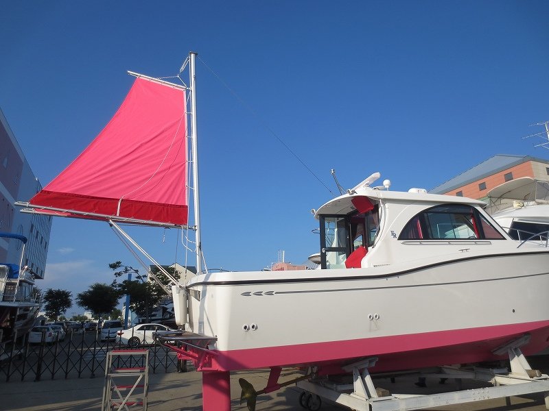 史上初?鮮やかなピンクの船底塗装!。それに合わせて、スパンカーもピンク!ハッキリ言って、目立ちます。