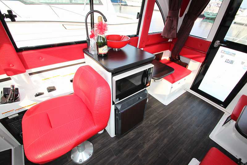 クッションレザー張替と同時にパッドやカーテンを追加。特注ギャレーに電子レンジ、冷蔵庫と小型シンクをビルトイン!床は土足OKなSフロア加工。